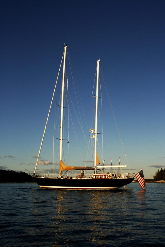 The concept: a blend of classical beauty and functional logic — beauty in the guise of long overhangs and a towering ketch rig; logic in the guise of a vessel that can be sailed easily shorthanded and maintained without an army, a boat that remains simple and comfortable to be aboard.